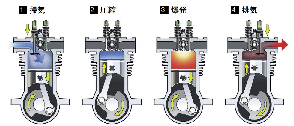 4 ストロークエンジンは 4 工程で一回の爆発をします 4 つの工程は 吸気 圧縮 爆発 排気です 2 ストロークエンジンでは吸気口や排気口がシリンダーにありますが 4 ストロークエンジンではバルブと呼ばれる吸気 排気弁が点火プラグのそばに. 4ストロークエンジンとは 大車林 英語 four stroke engineクランクシャフトが2回転する間に 吸入 圧縮 膨張 排気の4つのストロークでサイクルを完了するエンジン 4ストロークサイクルエンジンの略称 1ストロークとはピ. 4ストローク サイクル エンジン 一体何が4なのでしょうか 4ストロークエンジンの吸気行程 この図をみてピンと来るかたはすでに4ストをご存知だと思いますが なんじゃこりゃ.